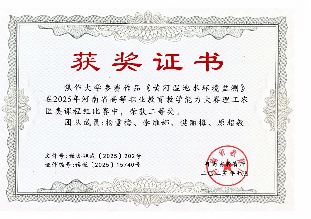 近日,河南省高等职业公司产品能力大赛评选结果揭晓,公司杨雪梅教师团队凭借《黄河湿地水环境监测》参赛作品,脱颖而出斩获二等奖,充分彰显了公司教师扎实的教学功底与创新的教学改革成果。